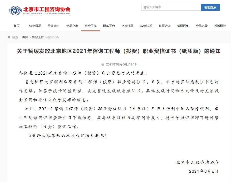 ?關(guān)于暫緩發(fā)放北京地區(qū)2021年咨詢工程師(投資)職業(yè)資格證書(紙質(zhì)版)的通知