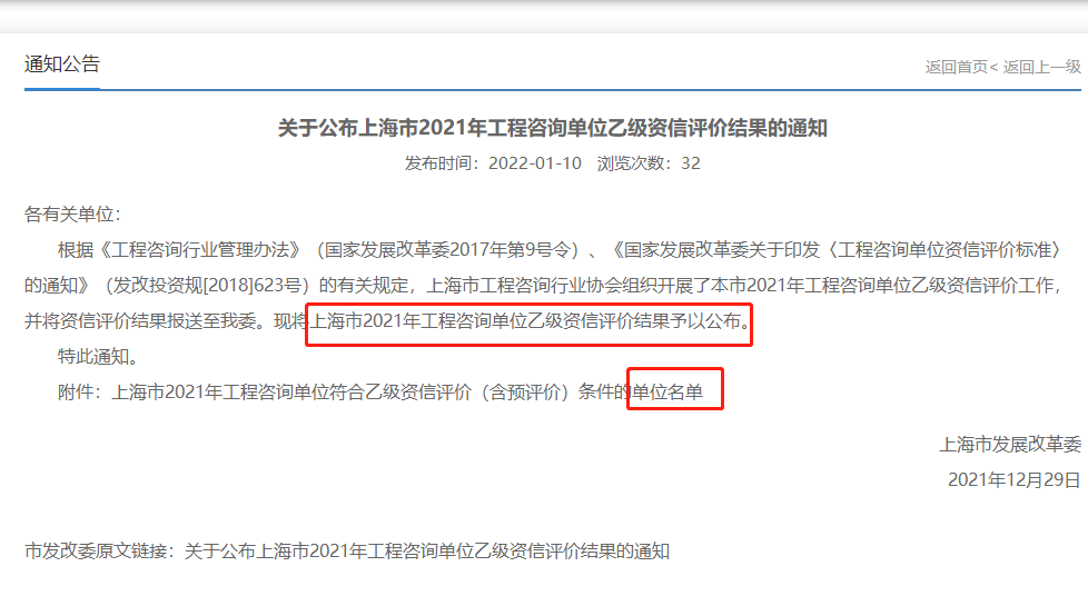 市發(fā)改委原文鏈接:關于公布上海市2021年工程咨詢單位乙級資信評價結(jié)果的通知